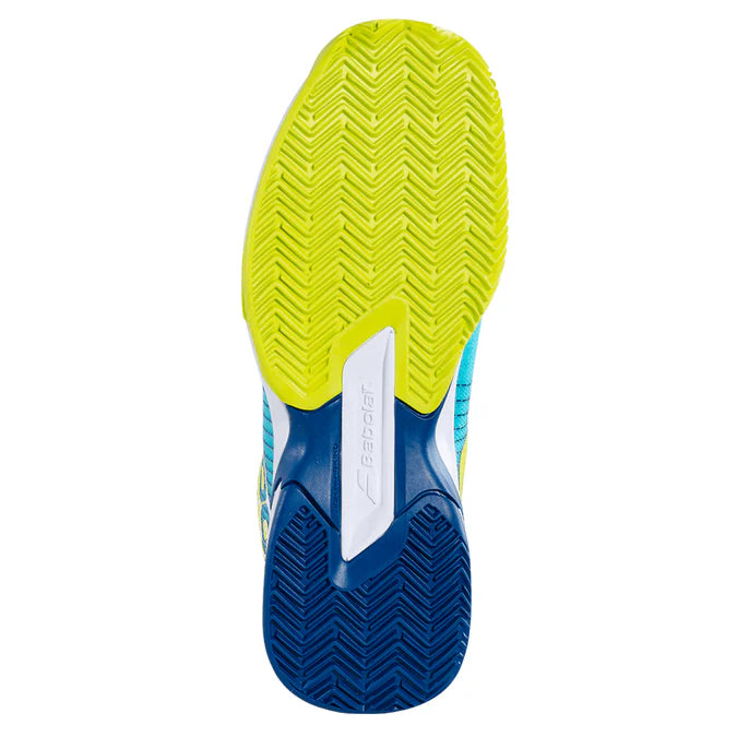 Jet Premura Junior från Babolat är en slittålig padelsko med en klassisk fiskbensmönstrad undersula som greppar tag i banan.